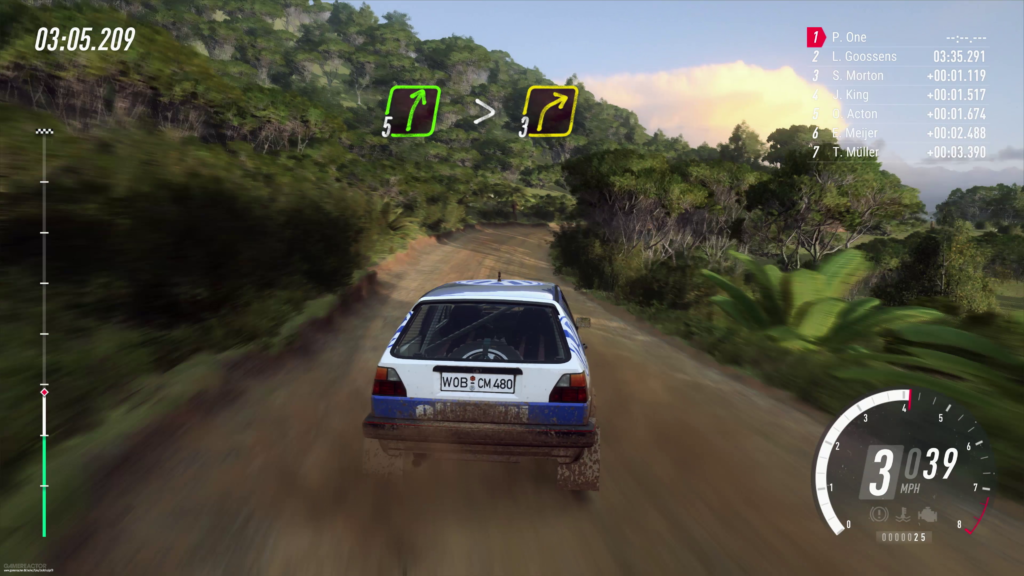 No está mal cortar curvas, pero a menudo tiene su riesgo, igual que ir a toda velocidad en cambios de rasante. En muchos juegos, el coche se daña y no solo por impactos con los límites de la pista, sino también por maltratar las ruedas, golpear el suelo en un aterrizaje muy fuerte o (si juegas con marchas) forzar la caja de cambios. Esto se aprende con el tiempo, y recibir daños en el coche es inevitable tarde o temprano. No hay que agobiarse por eso: una de las sensaciones más gratificantes es poder acabar una etapa con el coche perjudicado, sabiendo paliar las dificultades de manejo.